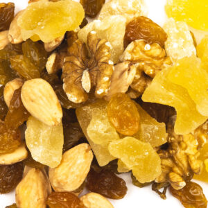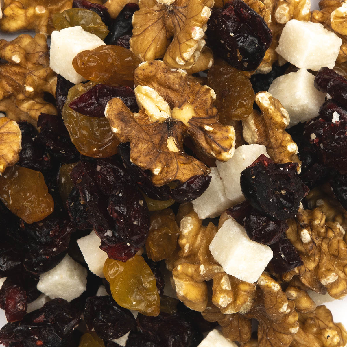 Frisse mix van cranberries, grote gele rozijnen, walnoten en kokosblokjes.