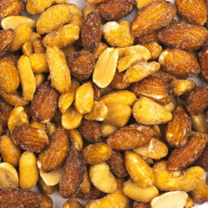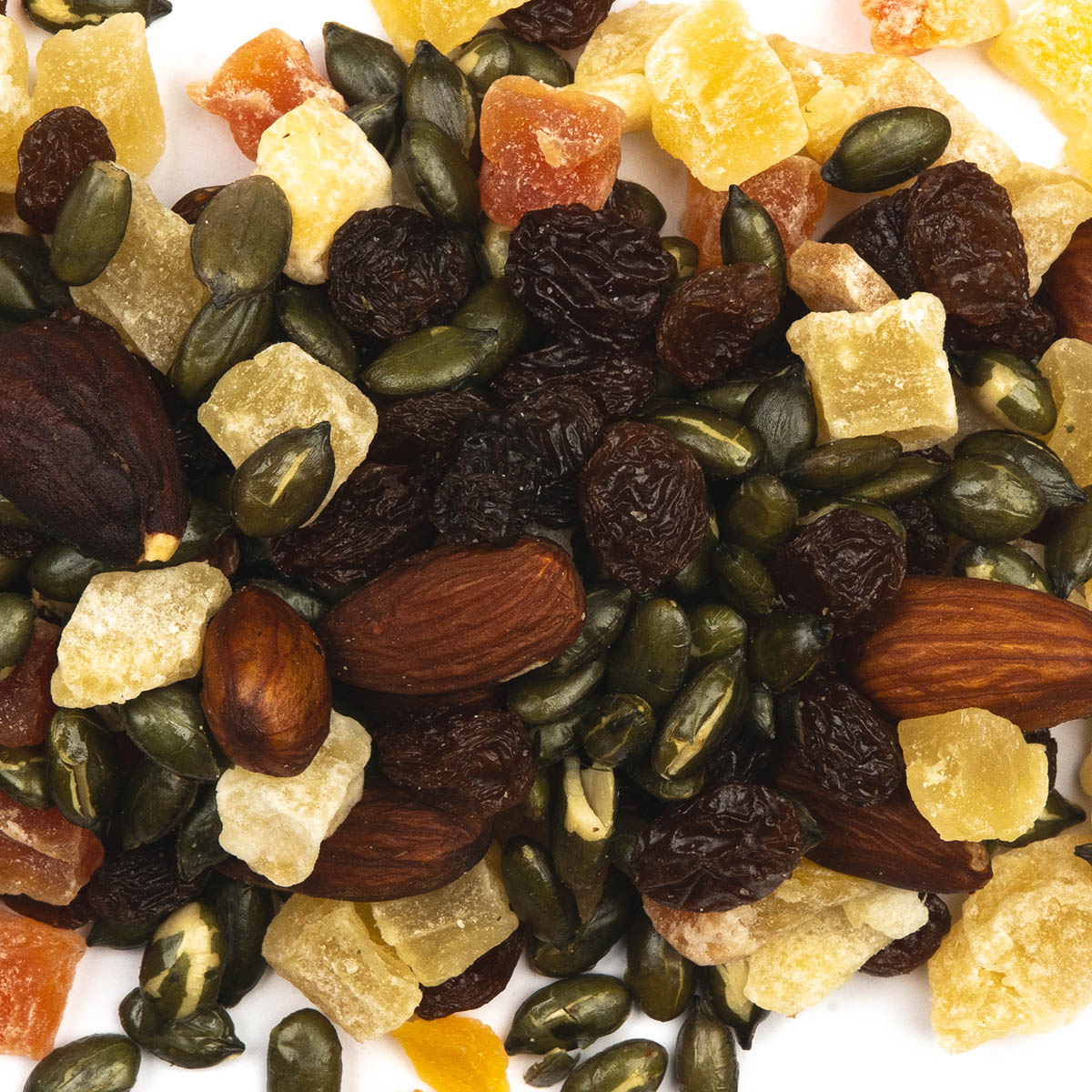 Mix van pepita’s, rozijnen, vruchten en amandelen dubbel gebrand.